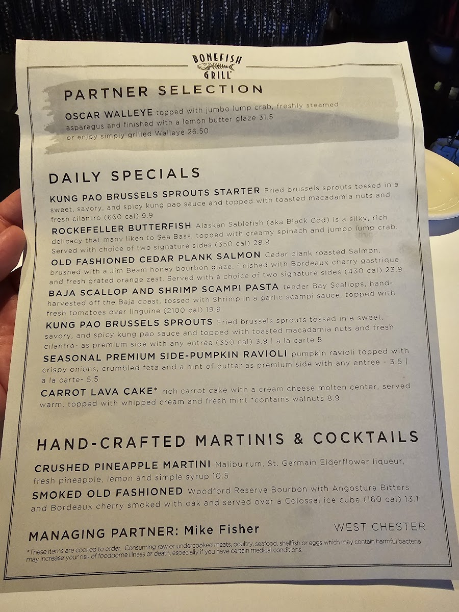 “ My wife and I had lunch here today. I had salmon and she had the Mahi-mahi. Both meals were pretty good. We also had some kind of garlic potatoes that were like French fries - neither one of us liked them. Our waitress was also the bartender which made our service wait long at times, but I believe she was doing her best. We regularly eat here so we will return at a later date. Update: 3/17/24, My wife and I a late lunch or early dinner here today. I had Blackened Salmon, with mash potatoes and a cauliflower dish cover with a thin batter (Excellent). My wife had the fried fish and chips, but potatoes instead of the chips. Pros: Salmon. bread, cauliflower and salad Cons: Fried fish - too greasy, mash potatoes look like they had been out awhile, but tasted ok to me - my wife didn't eat hers. Service for some reason was slow - it took over 30 minutes to be served our meals and the restaurant was not crowded - maybe 30%-40% full. Maybe there wasn't enough help in the kitchen. Bonefish fish and chips are always a hit or miss. We have them when they were better than any other restaurant we visited and other times it's just too greasy. I'm sure we will return, but not anytime soon. Update: 4/15/25, Had carryout here today. I ordered on-line and somehow I got my pickup time wrong on the order. When I called the restaurant to correct the time, the manager/head chef took care of the problem no questions ask. Our food was hot and excellent. Thank you and we hope to see you soon. ”